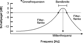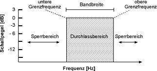 [Abb. 4.3] Ideales Filter Reale Filter haben keinen derart exakt ausgeschnittenen Übertragungsbereich in der Form eines Rechtecks wie das ideale Filter in [Abb. 4.3]. Bei realen Filtern werden Schallanteile bereits unmittelbar beiderseits der Mittenfrequenz auch innerhalb des Durchlassbereichs leicht gedämpft. Als Grenzfrequenzen werden die Frequenzen auf beiden Seiten der Mittenfrequenz angegeben, bei der die Dämpfung 3 dB beträgt. Die Bandbreite des Filters ist die Differenz zwischen diesen Grenzfrequenzen [siehe Abb. 4.4].