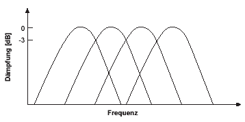 [Abb. 4.4] Reales Filter Ein Maß für die Exaktheit, mit der ein Filter Schallanteile jenseits des Übertragungsbereichs ausfiltert, ist die Filtergüte. Die Filtergüte ist an der Flankensteilheit des Filters ablesbar. Sie wird in dB pro Oktave angegeben. Je steiler die Flanken jenseits der Grenzfrequenzen abfallen, desto schärfer ist das Filter abgestimmt und desto größer ist seine Filtergüte. Um den gesamten hörbaren Frequenzbereich mit Bandpassfiltern abzudecken, sind sehr viele überlappende Filter mit nahe beieinander liegenden Mittenfrequenzen notwendig [siehe Abb. 4.5].