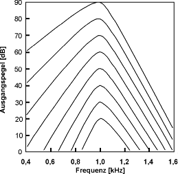 So lässt sich feststellen, dass sich die auditiven Filter nicht linear verhalten: Ihre Form verändert sich in Abhängigkeit vom Pegel des Eingangssignals.