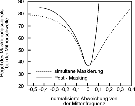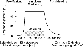 [Abb.4.11] Nicht-Simultane Maskierung. Die Abbildung teilt sich in zwei Bereiche: Die eingezeichnete Kurve zeigt, dass der Maskierer in geringem Maße Maskierungseffekte für Testsignale im Bereich ab 50 ms vor seinem Einsetzen auslöst. Deutlichere Maskierungseffekte ergeben sich 150-200 ms nach dem Ende des Maskierers. Die Form der auditiven Filter ist bei Post-Masking schmaler. Daraus ergeben sich geringere Werte für die kritischen Bandbreiten bzw. ERBs bei dieser Art nicht-simultaner Maskierung.