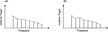 [Abb. 6.1] Zwei weitgehend identische Spektren aus je 8 Sinustönen. Lediglich der Pegel einer Komponente ist in (b) angehoben. Der Unterschied in der Form des Spektrums wird besonders in der gestrichlet eingezeichneten Hüllkurve deutlich. Die Existenz eines Mechanismus der Profilanalyse ist angesichts unserer Alltagserfahrung nicht überraschend: Die Unterscheidbarkeit von Klangfarben bzw. Klangqualität von Musikintrumenten oder die Unterscheidung von Vokalen unabhängig von deren Gesamtlautstärke erscheint uns selbstverständlich. Diese Fähigkeit muss auf einem Vergleich der spektralen Form beruhen. Dies bedeutet, dass ein Vergleich der relativen Ausgangspegel mehrerer auditiver Filter unabhängig vom Gesamtpegel stattfindet, so dass die Annahmen des Energiespektrum-Modells nicht zutreffen können. Experimenteller Nachweis der Profilanalyse Experimentelle Hinweise auf diese Art der Schallverarbeitung über mehrere auditive Filter hinweg wurden erst 1981 von Spiegel, Picardi und Green beschrieben. Green (1988) führte eine Reihe von Experimenten durch, in denen die Wahrnehmbarkeit von Pegelanhebungen einer einzelnen Komponente im Spektrum eines komplexen Signals untersucht wurde. Probanden waren in der Lage, sehr geringe Pegelveränderungen