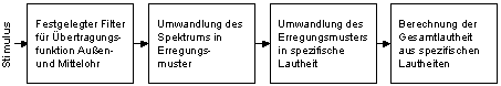 Die Gesamtlautheit komplexer Stimuli hängt nach diesem Modell von der Summation der neuronalen Aktivität über mehrere Frequenzkanäle hinweg ab. Es gibt verschiedene Modell, die die Lautheitssummation mittels neuronale Erregungsmuster zu erklären versuchen. Sie haben haben die gleiche Grundstruktur, die aus mehreren Stufen besteht. [Abb. 5.11] Grundstruktur von Modellen der Lautheit Die erste Stufe ist ein Filter, das der Übertragungsfunktion des äußeren Ohres entspricht. Die zweite Stufe ist eine Berechnung des neuronalen Erregungsmusters für die einzelnen Komponenten des Gesamtsignals auf der Basis eines Maßes der Anregung. Die tatsächlichen Aktivität von Neuronen als Reaktion auf Stimuli bestimmter Intensität ist schwer abschätzbar, da sich sowohl die spontane als auch die maximalen Reaktionen von Neuron zu Neuron oft erheblich unterscheiden. Daher werden neuronale Erregungsmuster in Lautheitsmodellen oft durch das Maß der effektiven Anregung über eine bestimmten Abschnitt der Basilarmembran repräsentiert. Die Anregung wird aus der Intensität der Schallstimuli abgeleitet. Auf der dritten Stufe erfolgt eine Umwandlung von der Anregung in eine spezifische Lautheit innerhalb einer kritischen Bandbreite. Die Lautheit des Gesamtsgnals wird auf der vierten Stufe aus den spezifischen Lautheiten errechnet. |
